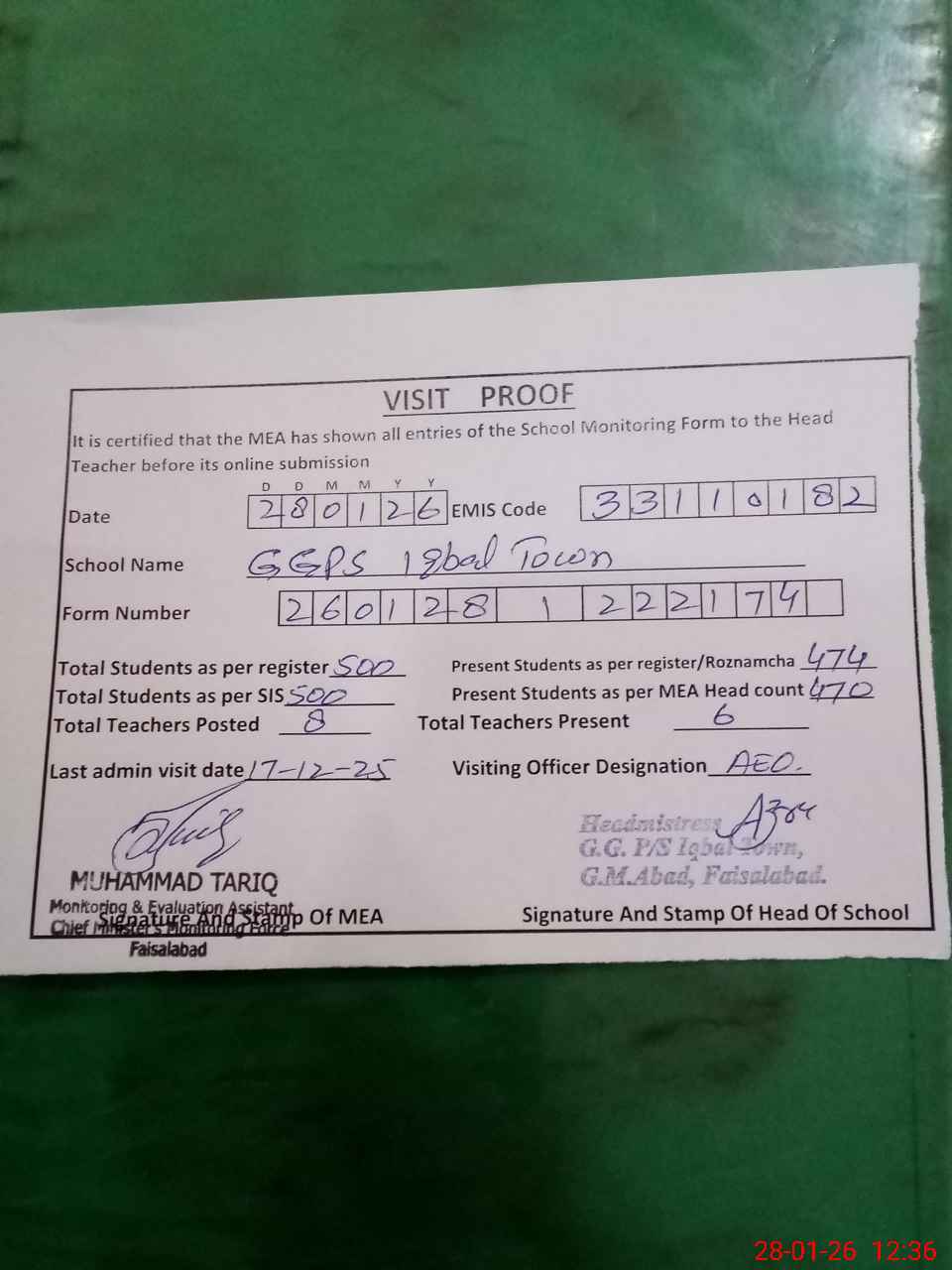| Attendance Register | Head Teacher | MEA with School | Visit Proof |