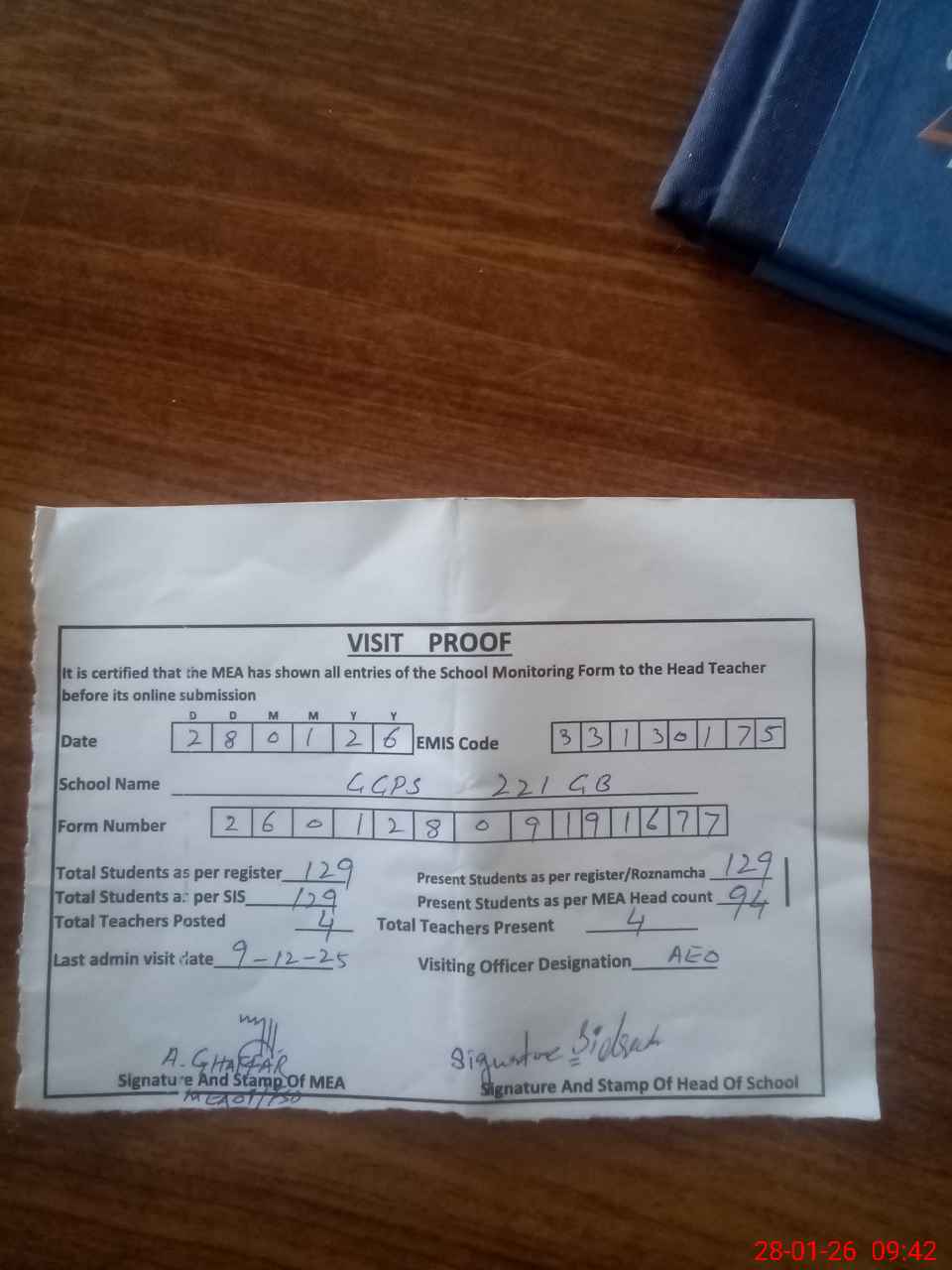 | Attendance Register | Head Teacher | MEA with School | Visit Proof |