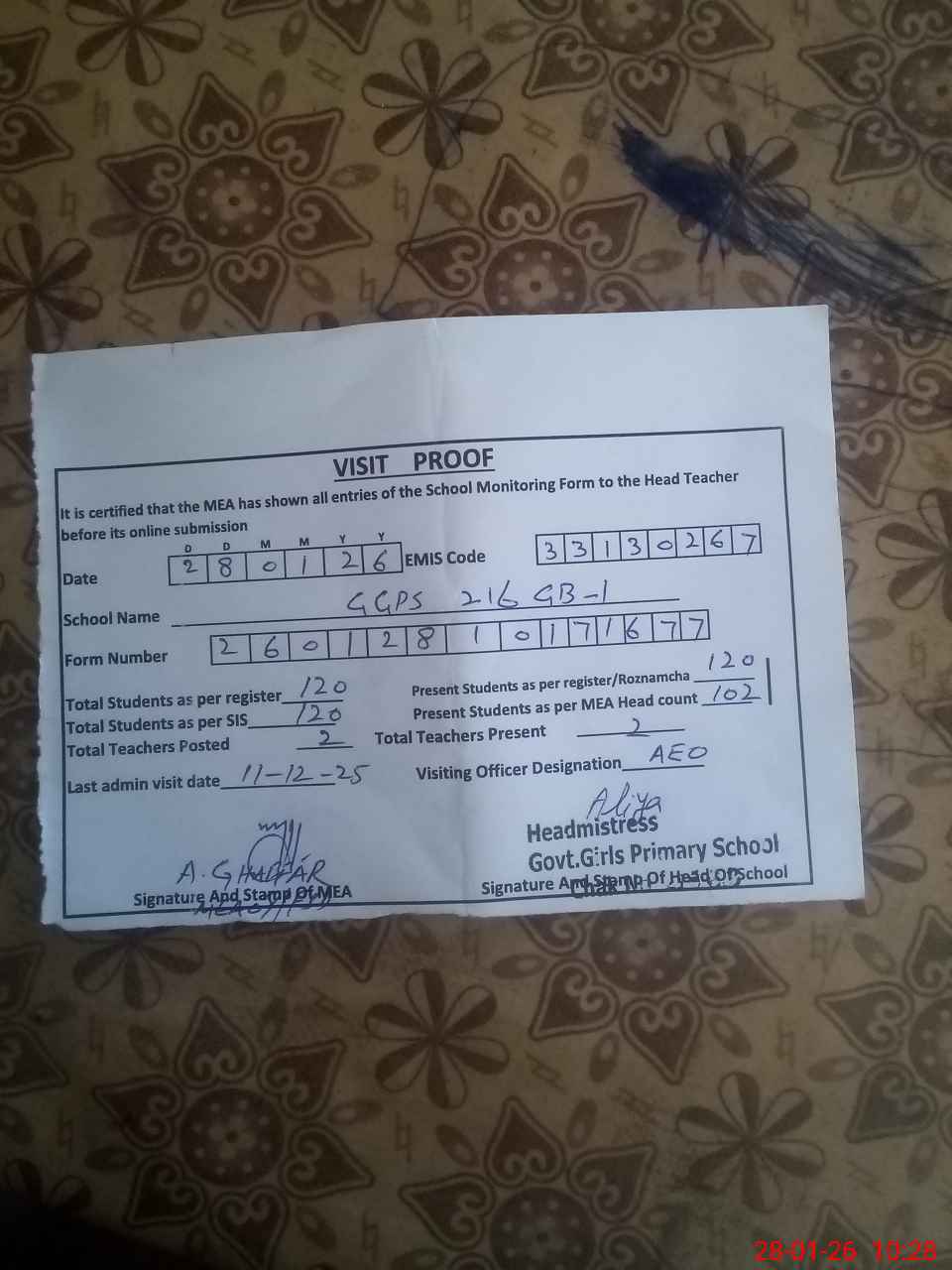 | EMIS Code: 33130267 | Name of School: GGPS CHAK 216 GB I MAMUNKANJAN | |||