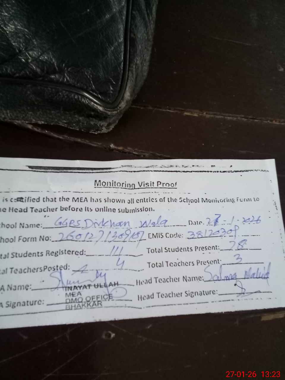 | Attendance Register | Head Teacher | MEA with School | Visit Proof |