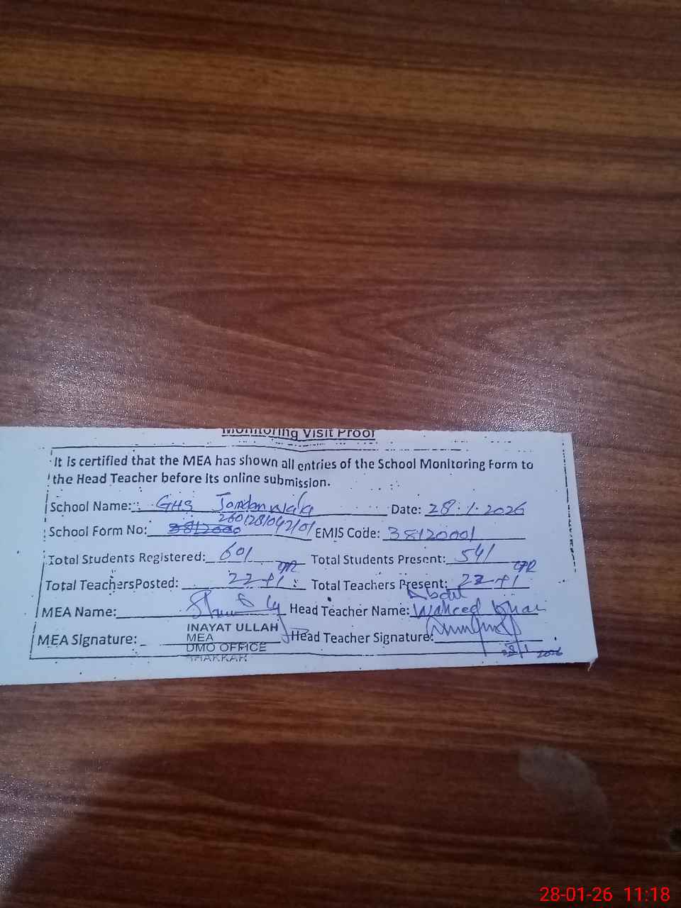 | Attendance Register | Head Teacher | MEA with School | Visit Proof |