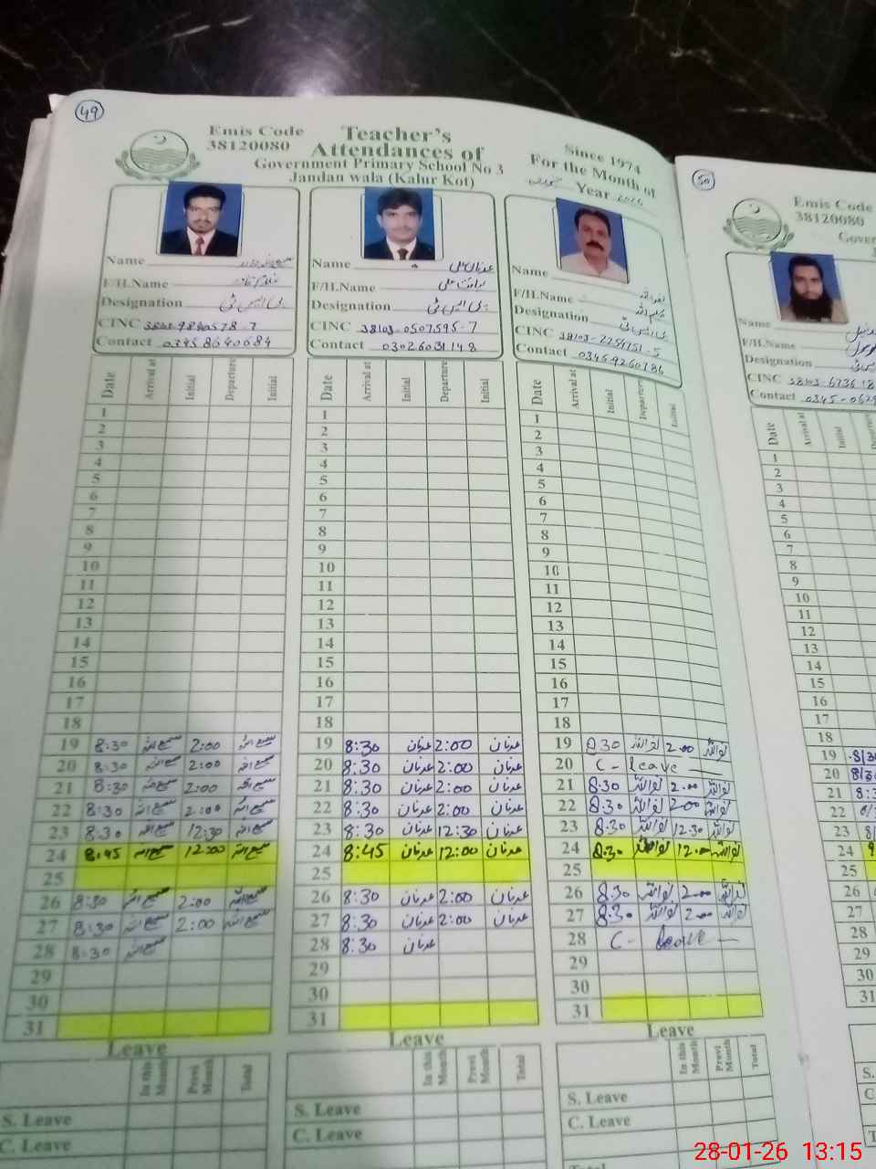 | CNIC | Full Name | Designation | R/C | Absence during last cal. month |