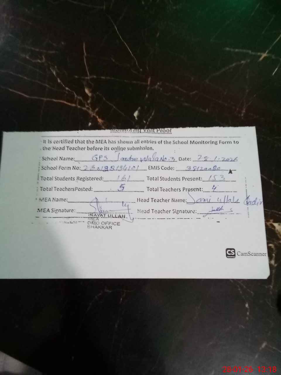 | Attendance Register | Head Teacher | MEA with School | Visit Proof |