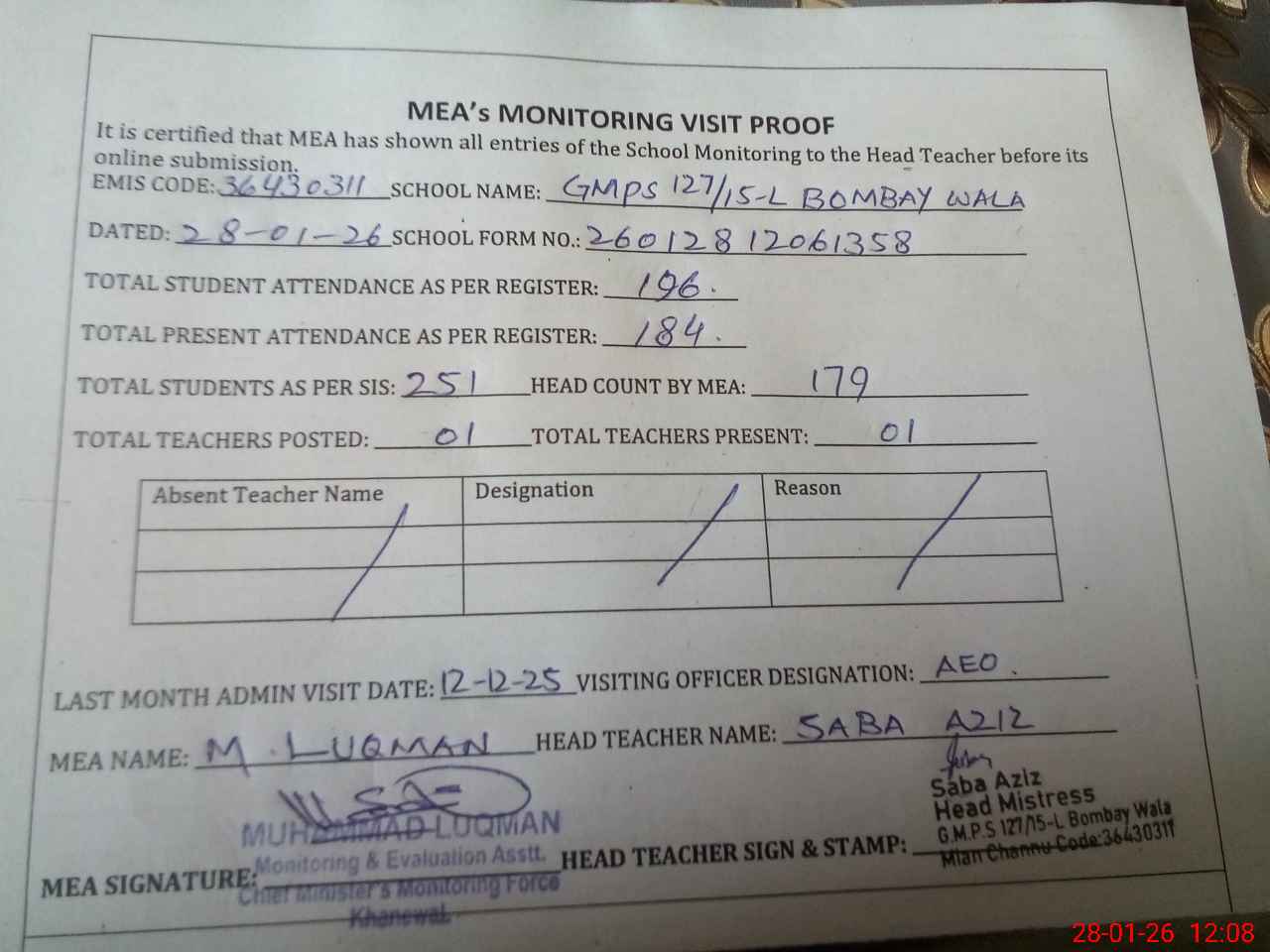 | Attendance Register | Head Teacher | MEA with School | Visit Proof |