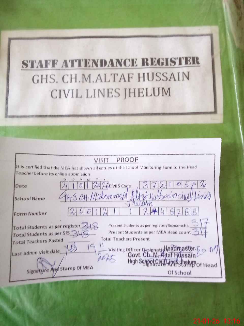 | EMIS Code: 37210502 | Name of School: GHS CH. MUHAMMAD ALTAF HUSSAIN CIVIL LINES JHELUM | |||