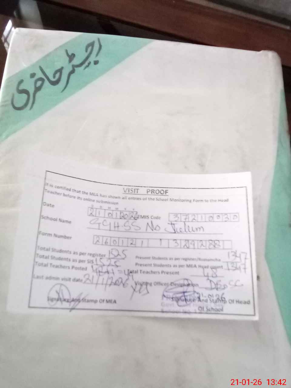 | Attendance Register | Head Teacher | MEA with School | Visit Proof |