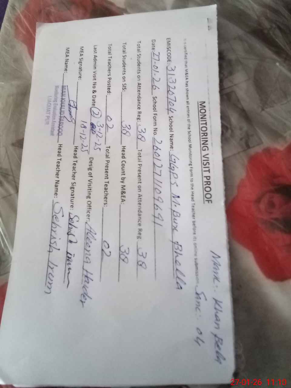| Attendance Register | Head Teacher | MEA with School | Visit Proof |