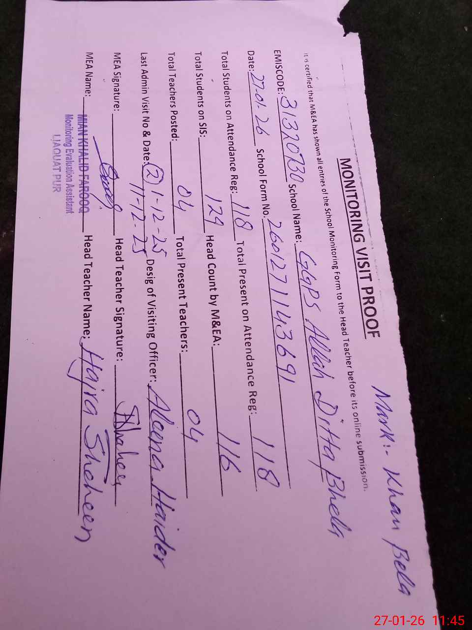 | EMIS Code: 31320730 | Name of School: GGPS ALLAH DITTA BEHLA | |||