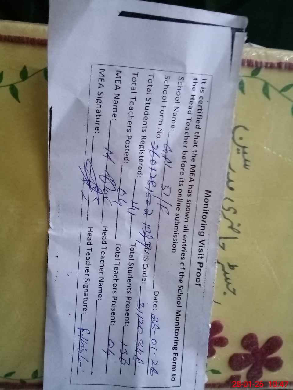 | Attendance Register | Head Teacher | MEA with School | Visit Proof |