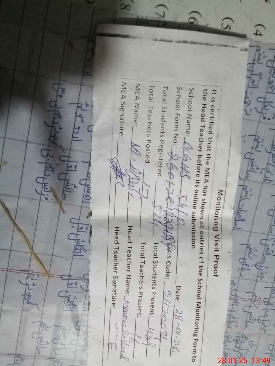 | Attendance Register | Head Teacher | MEA with School | Visit Proof |