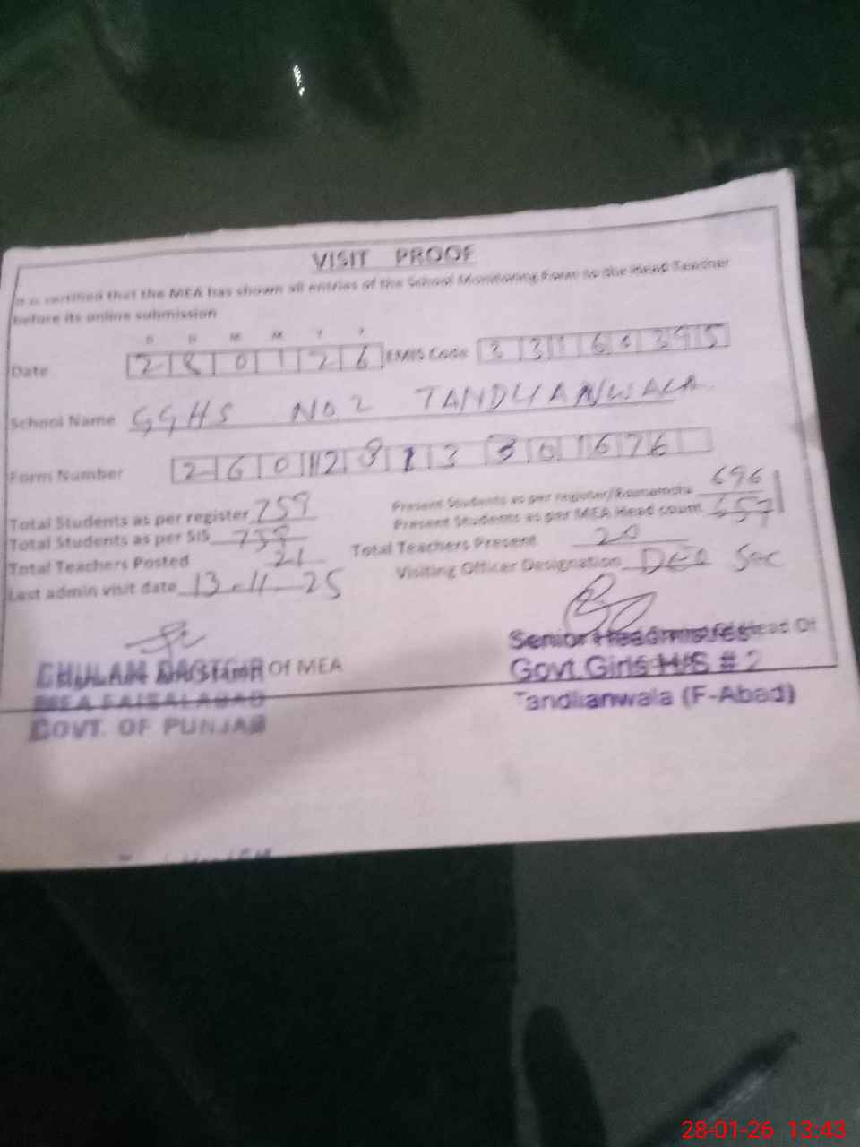 | Attendance Register | Head Teacher | MEA with School | Visit Proof |