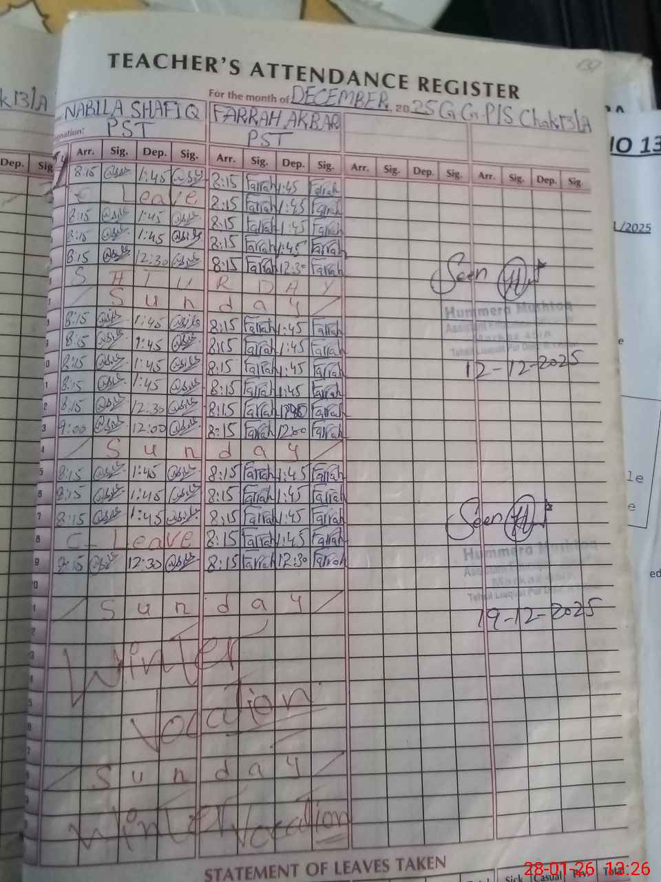 | CNIC | Full Name | Designation | R/C | Absence During Last Calender Month |