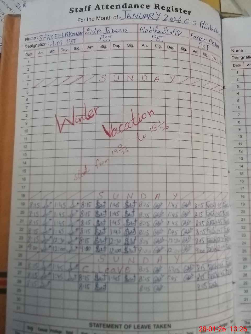 | Leave | Duty | Absent | Maternity | Medical | Ex- Pak |