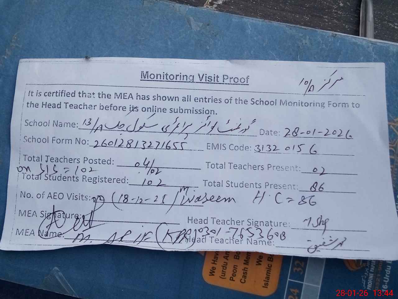 | EMIS Code: 31320156 | Name of School: GPS CHAK NO. 13/A | |||