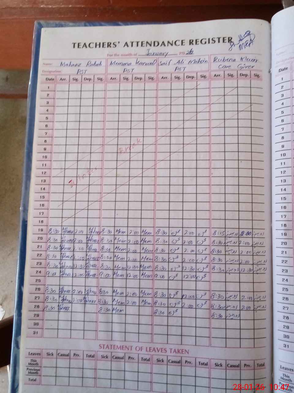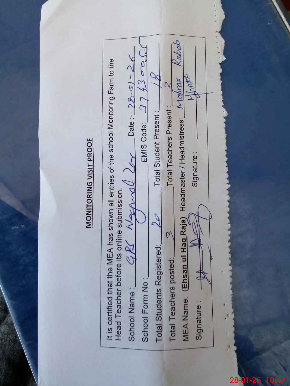 | Attendance Register | Head Teacher | MEA with School | Visit Proof |