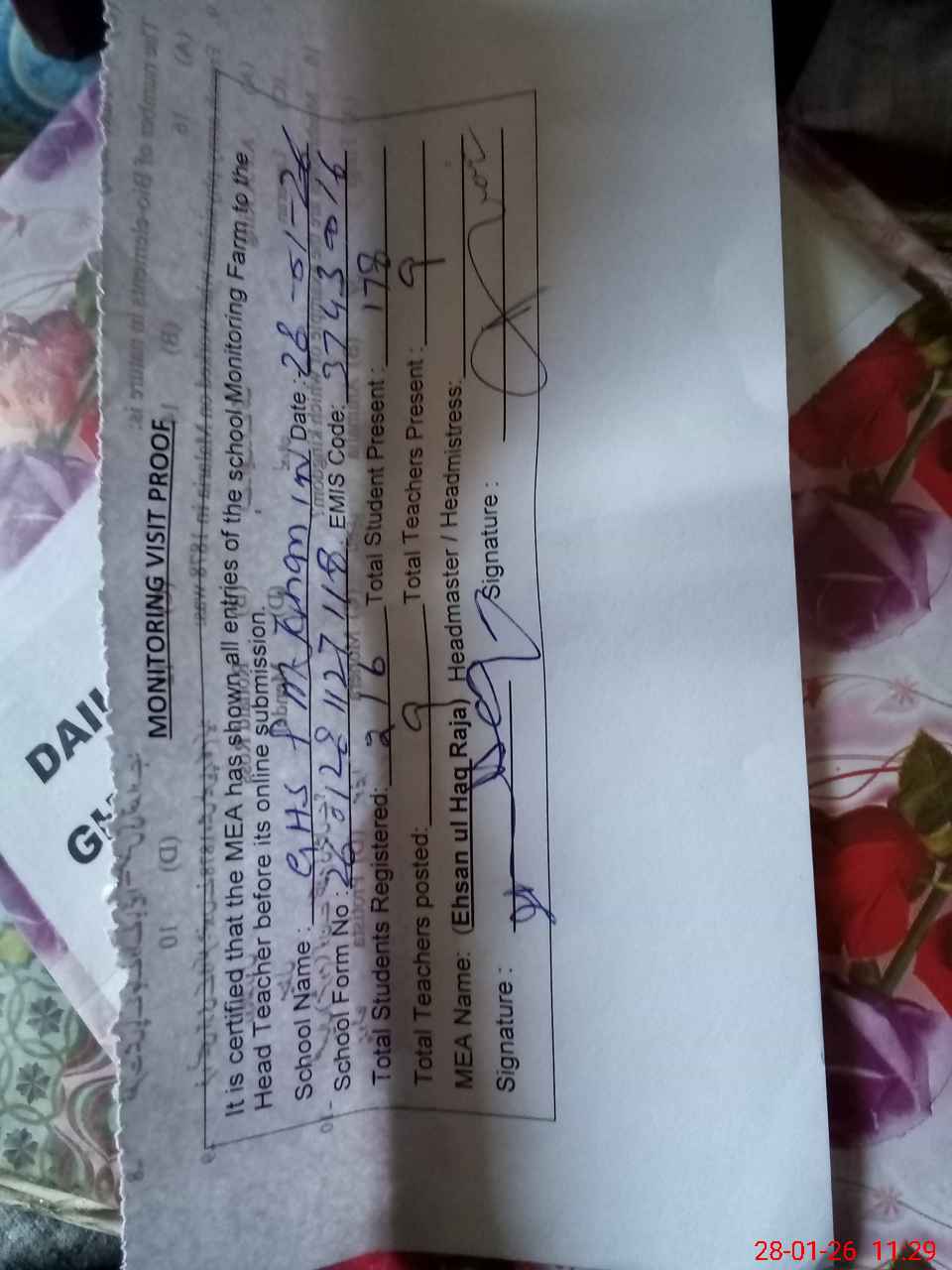 | Attendance Register | Head Teacher | MEA with School | Visit Proof |