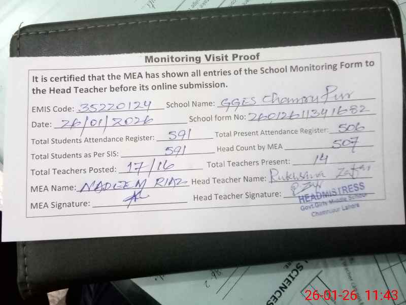 | Attendance Register | Head Teacher | MEA with School | Visit Proof |