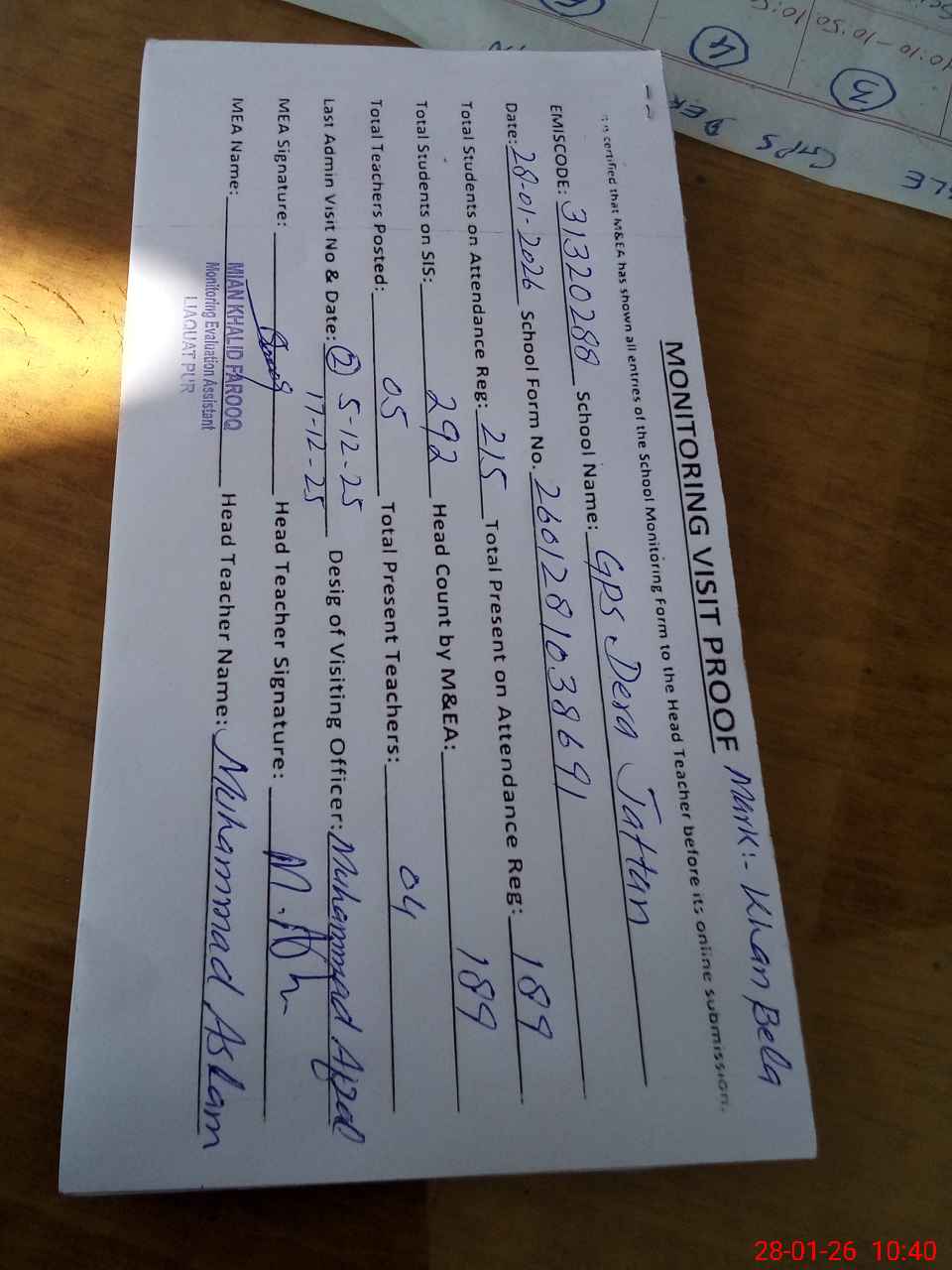 | Attendance Register | Head Teacher | MEA with School | Visit Proof |