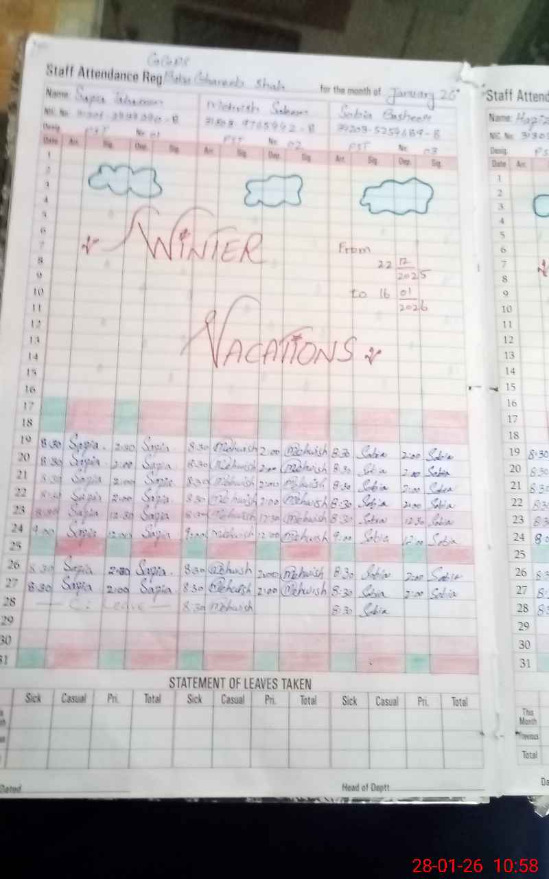 | Total no. of Classrooms: 7 No. of Classrooms Used for Teaching: 6 No. of Classrooms Storing Old Furniture, FTBs, etc: 0Comments if Any: NSB record not maintained after July 2025 Attendance for teachers and students on SIS not maintained. |