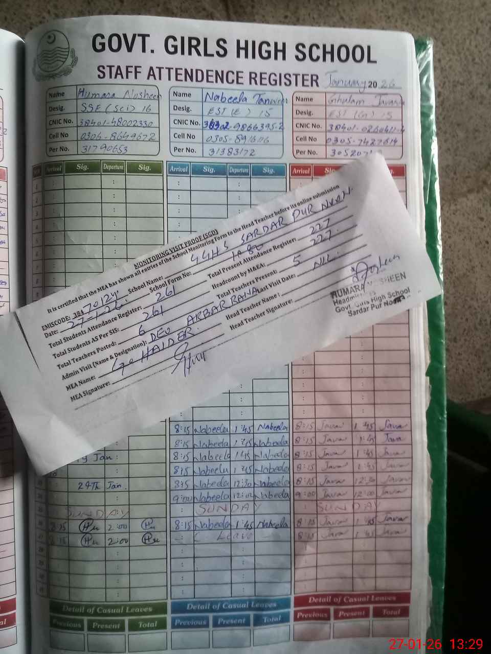 | CNIC | Full Name | Designation | R/C | Absence During Last Calender Month |