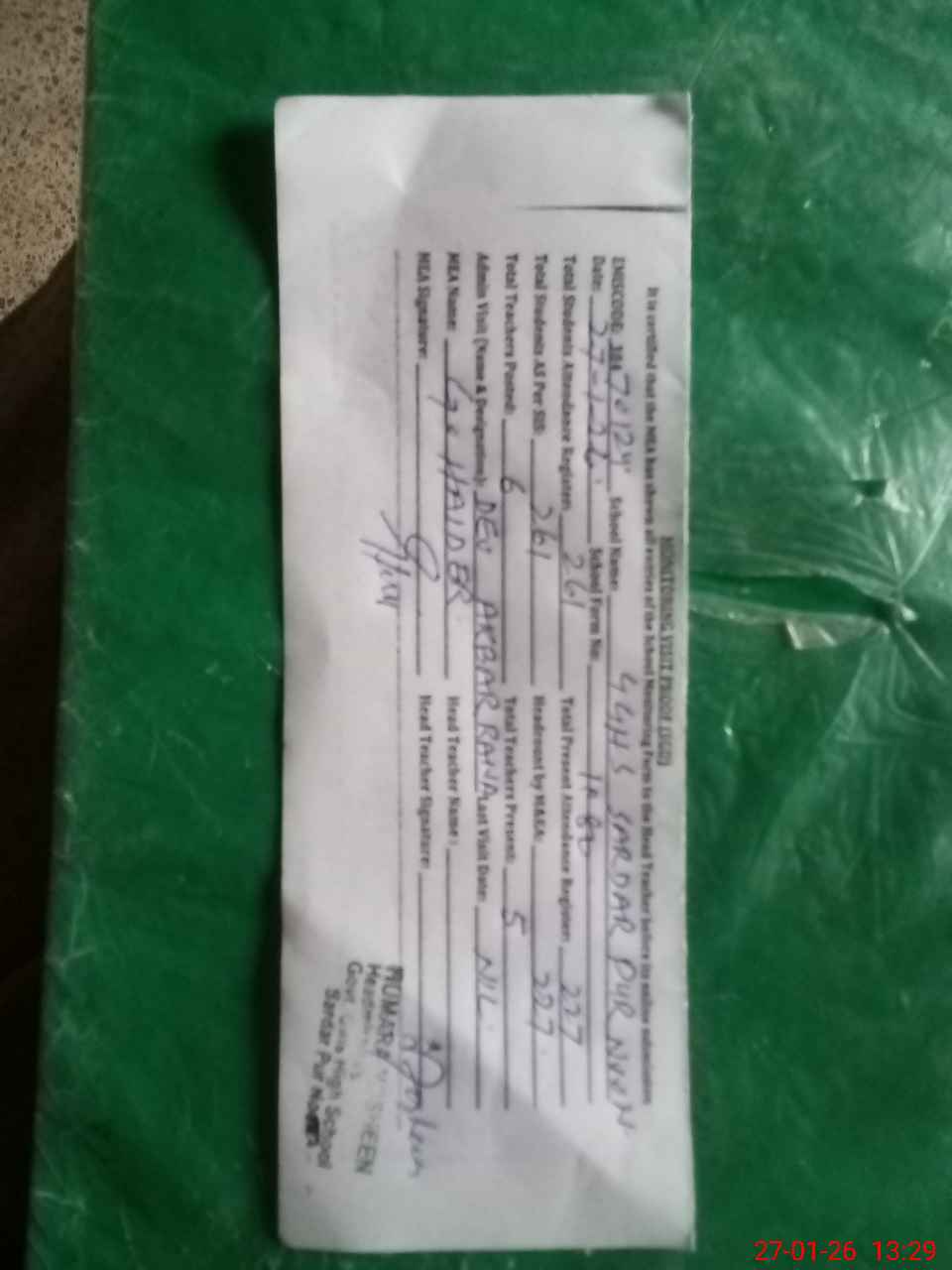 | Attendance Register | Head Teacher | MEA with School | Visit Proof |