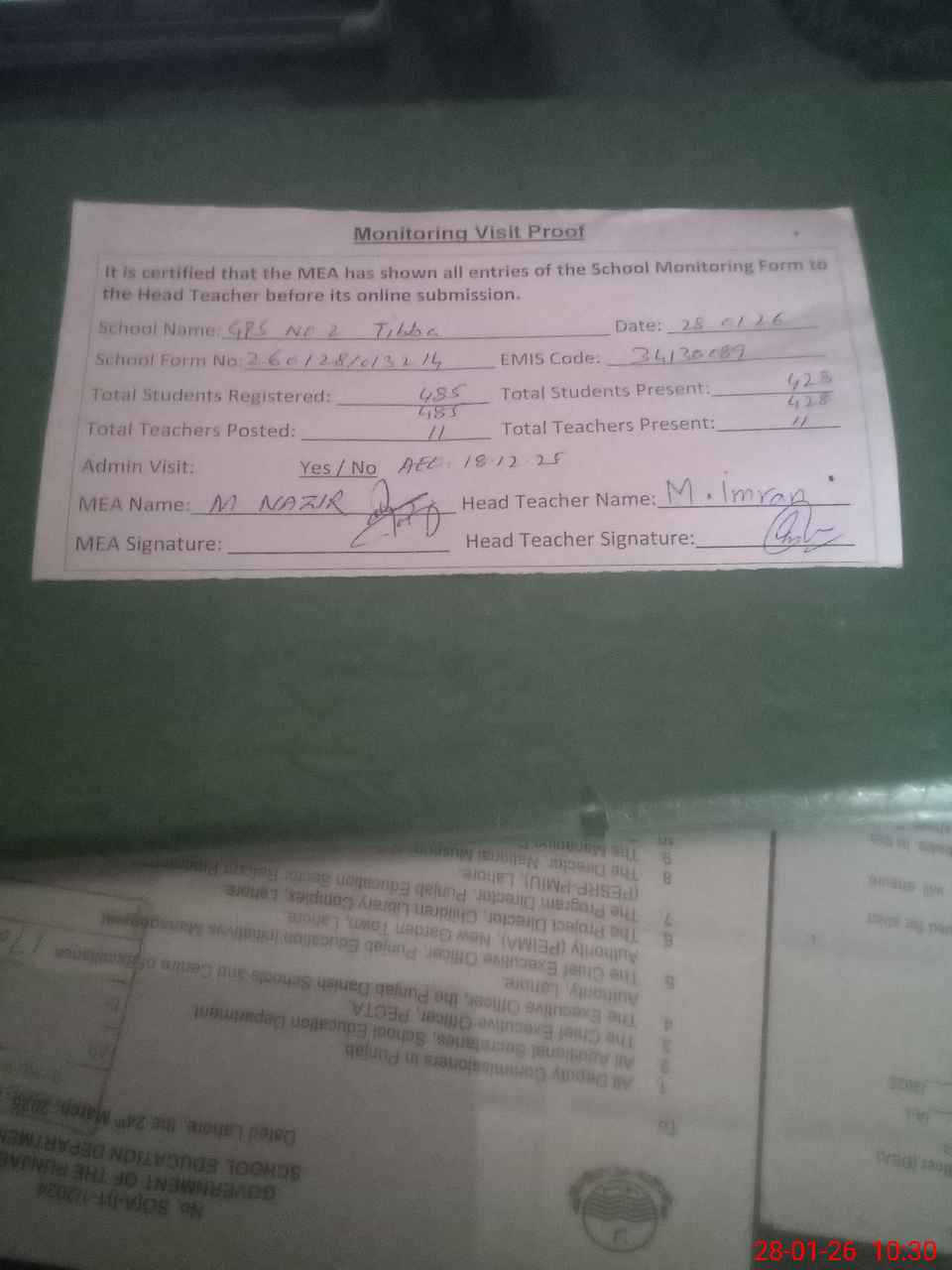 | Attendance Register | Head Teacher | MEA with School | Visit Proof |