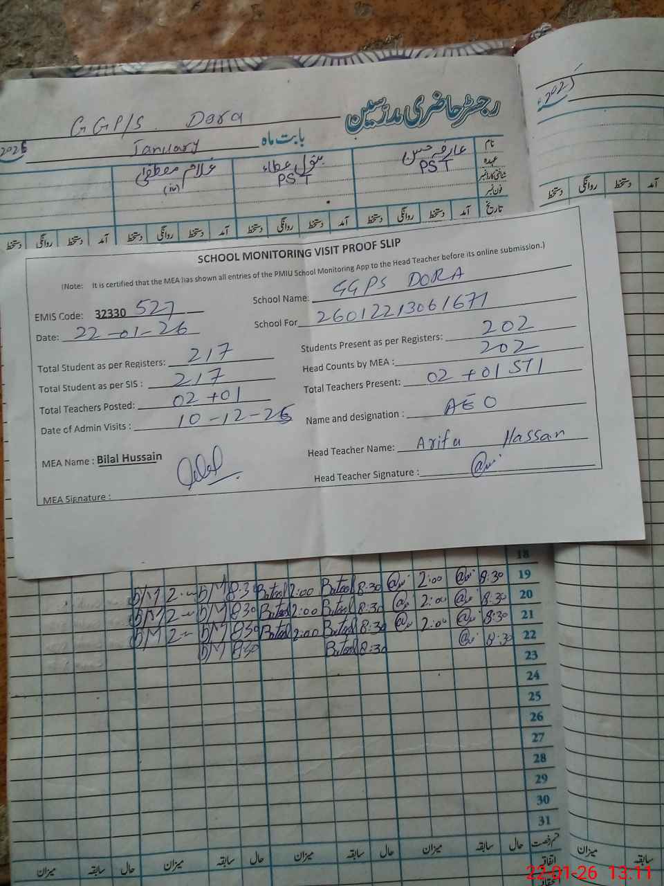 | Attendance Register | Head Teacher | MEA with School | Visit Proof |