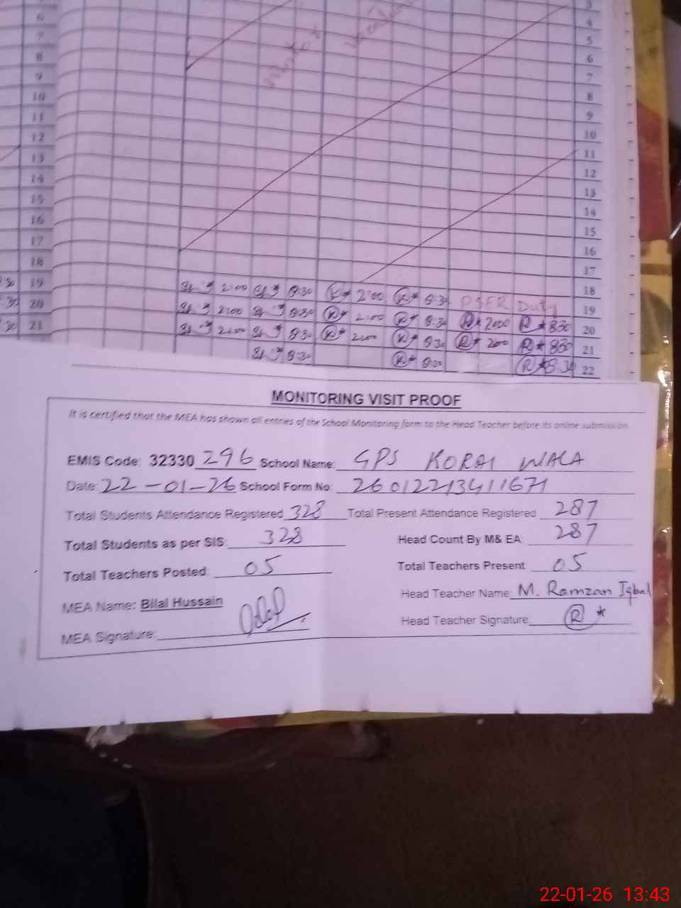 | Attendance Register | Head Teacher | MEA with School | Visit Proof |