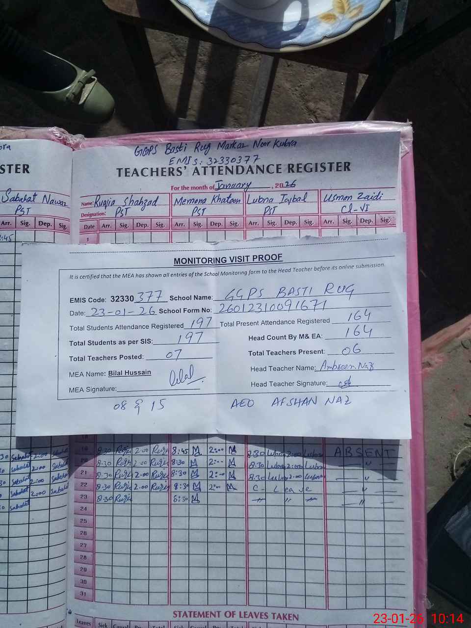 | Attendance Register | Head Teacher | MEA with School | Visit Proof |