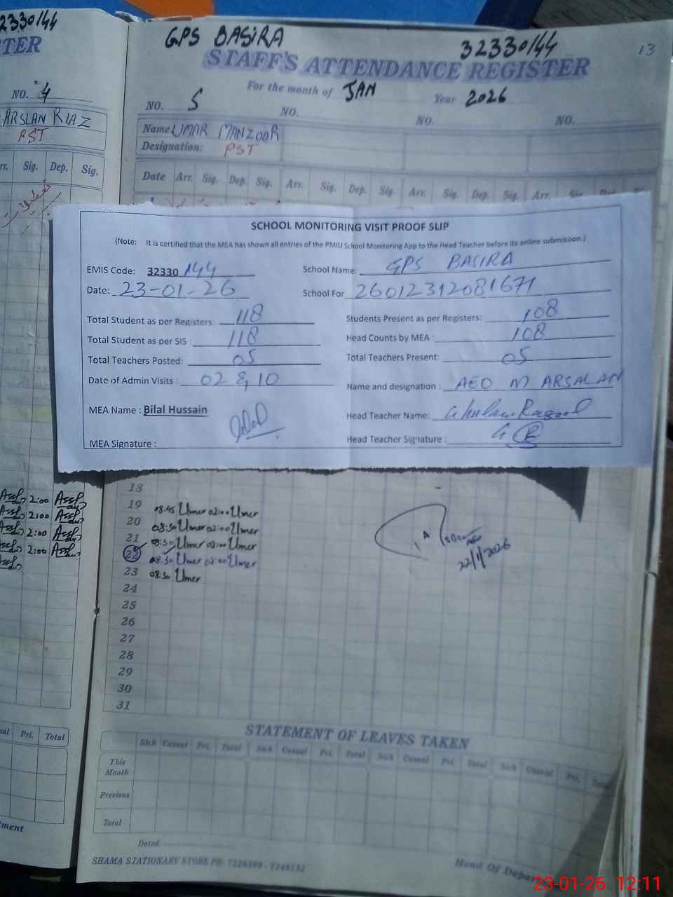 | Attendance Register | Head Teacher | MEA with School | Visit Proof |