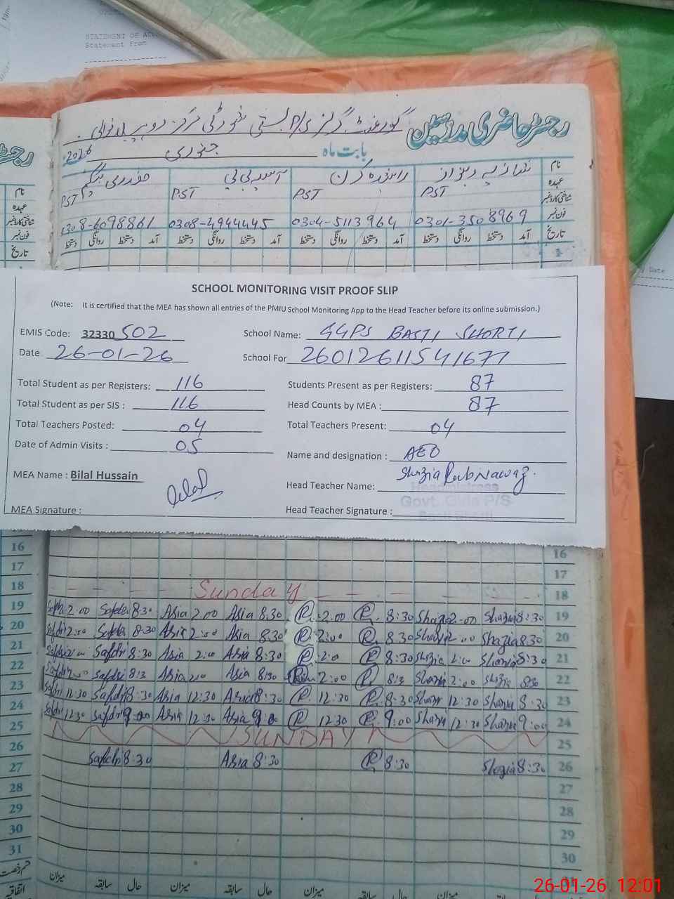 | Attendance Register | Head Teacher | MEA with School | Visit Proof |