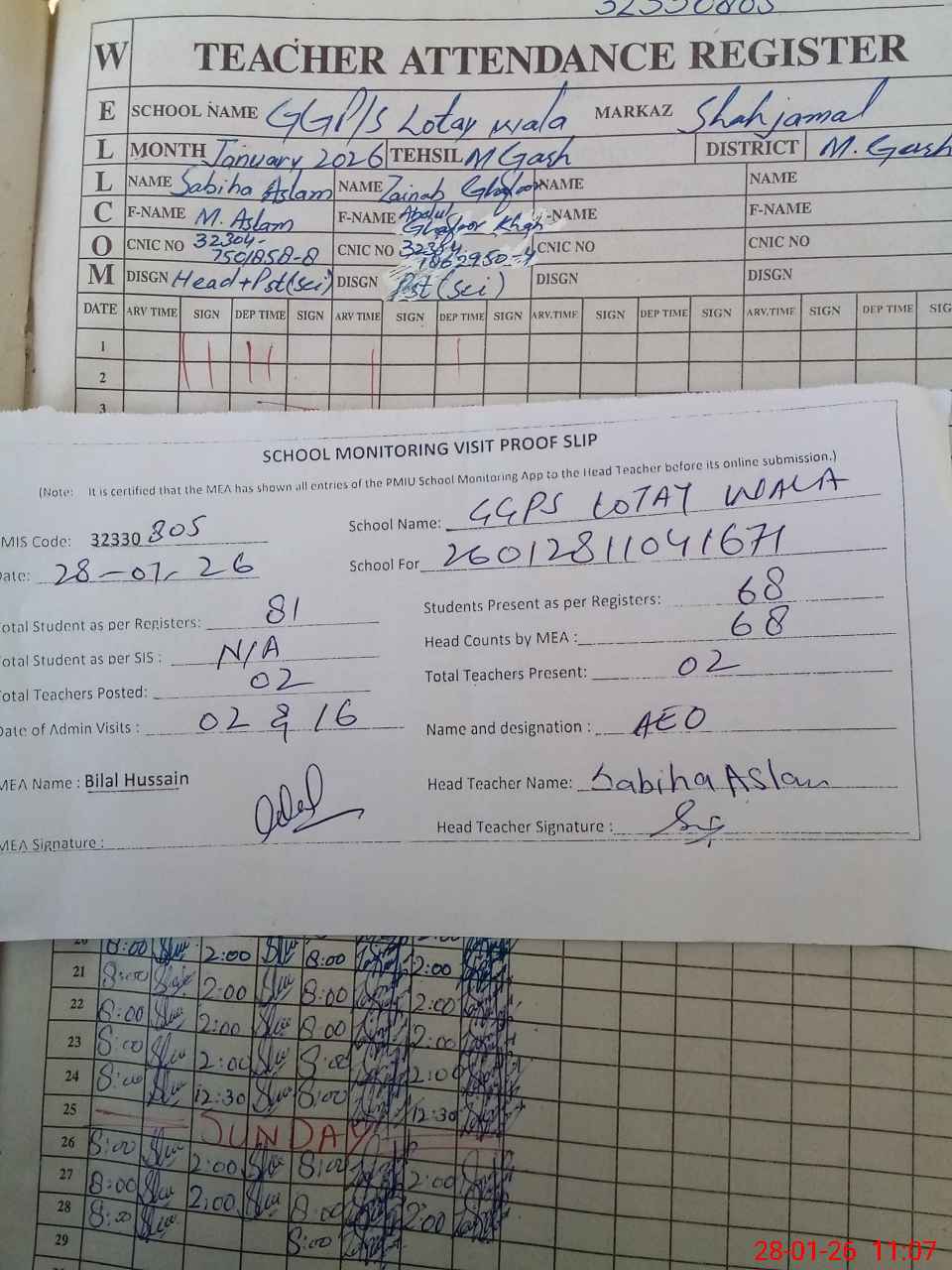 | Attendance Register | Head Teacher | MEA with School | Visit Proof |