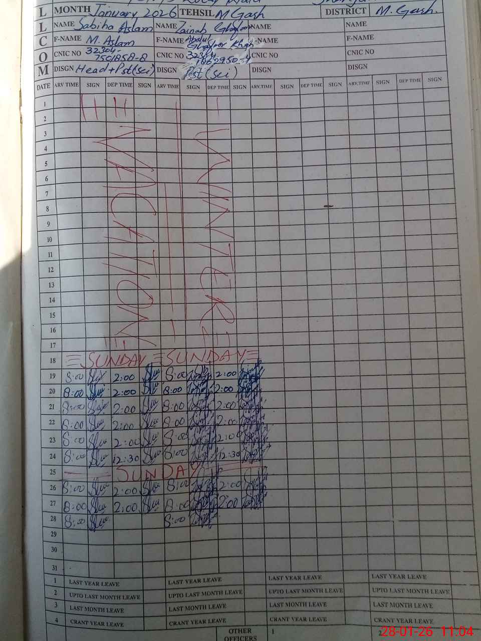 | CNIC | Full Name | Designation | R/C | Absence During Last Calender Month |