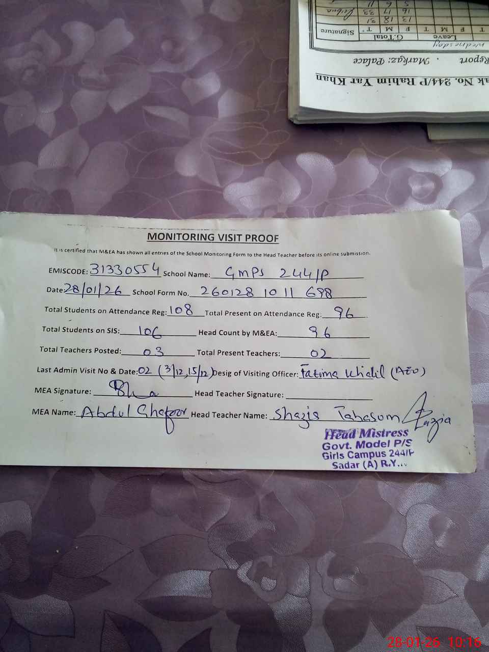 | Attendance Register | Head Teacher | MEA with School | Visit Proof |