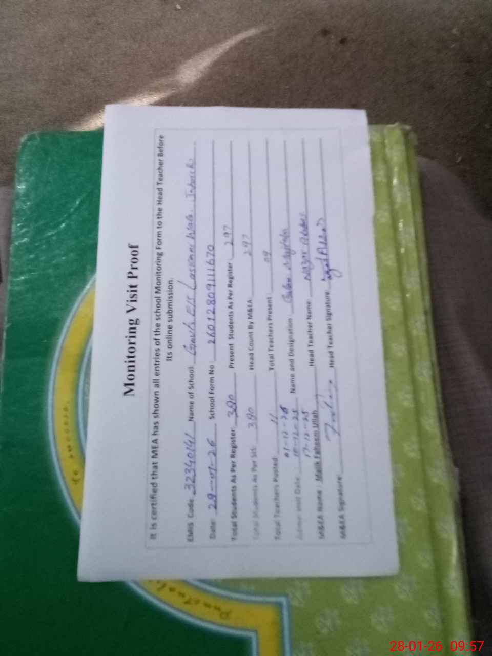 | Attendance Register | Head Teacher | MEA with School | Visit Proof |