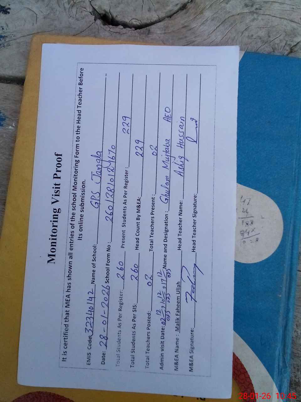 | Attendance Register | Head Teacher | MEA with School | Visit Proof |