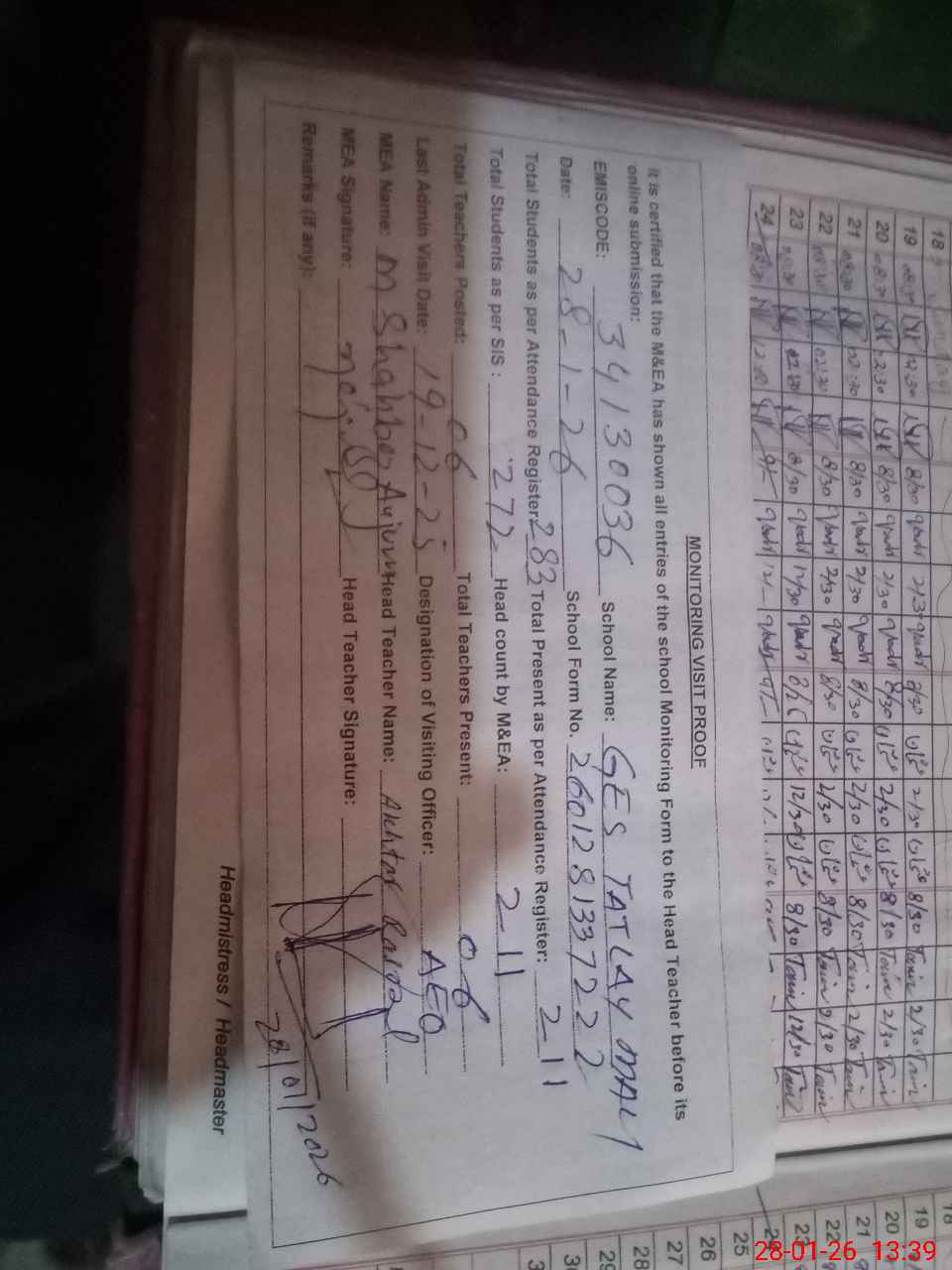 | Certified that this School was Inspected by the Undersigned MEA/DMO Today and the Information Stated Above is as Per Record. | |||||