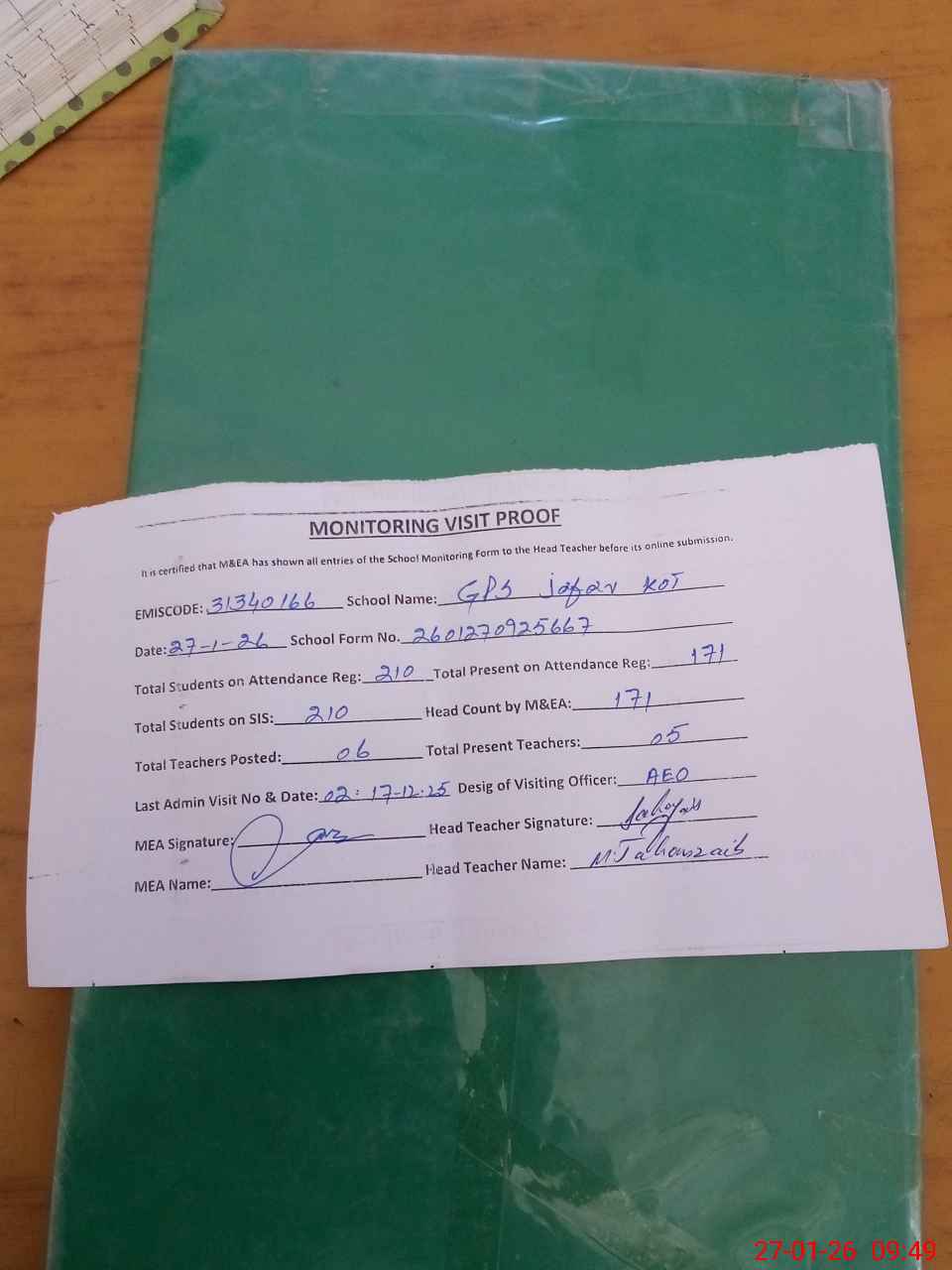 | Attendance Register | Head Teacher | MEA with School | Visit Proof |