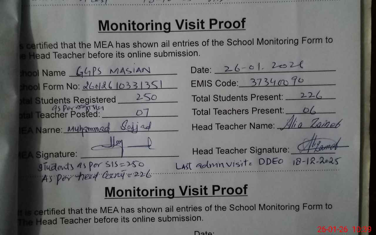 | Monitoring Date: 26-01-2026 | Start Time: 26-01-2026 10:02 AM | End Time: 26-01-2026 10:39 AM | Name of MEA: Mu**** Sa**** | |