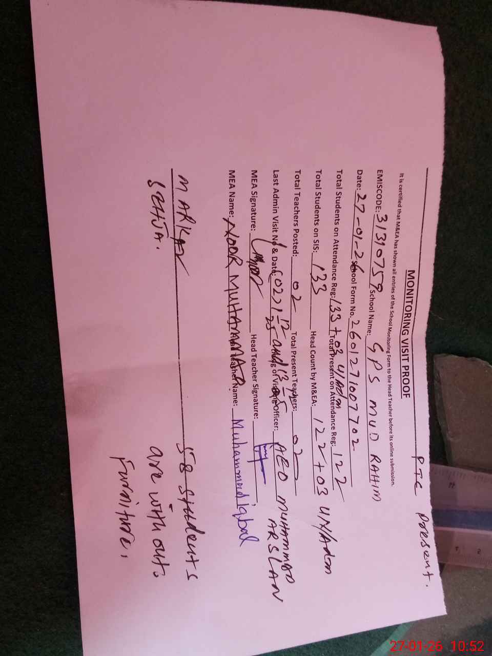 | Attendance Register | Head Teacher | MEA with School | Visit Proof |