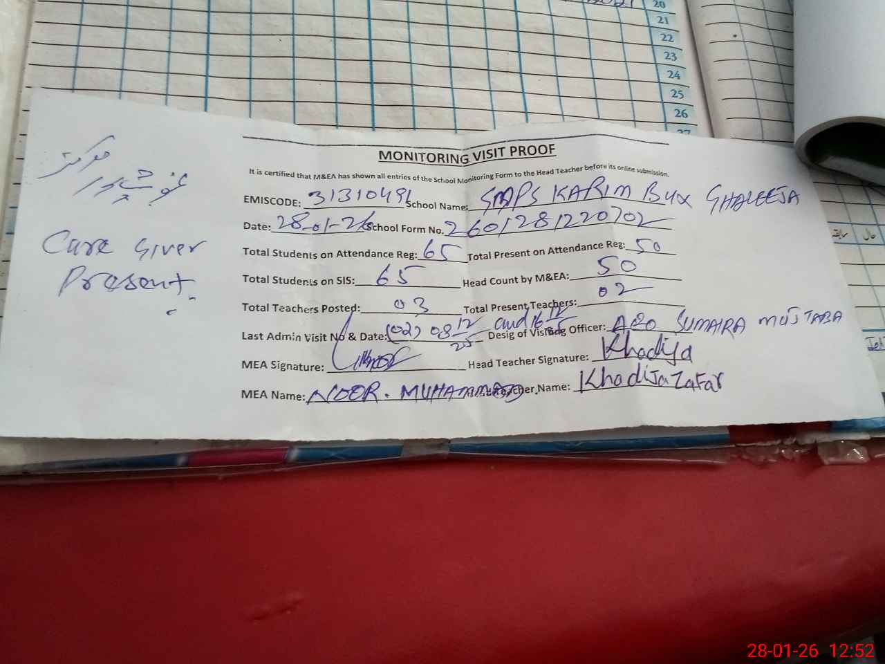 | Attendance Register | Head Teacher | MEA with School | Visit Proof |