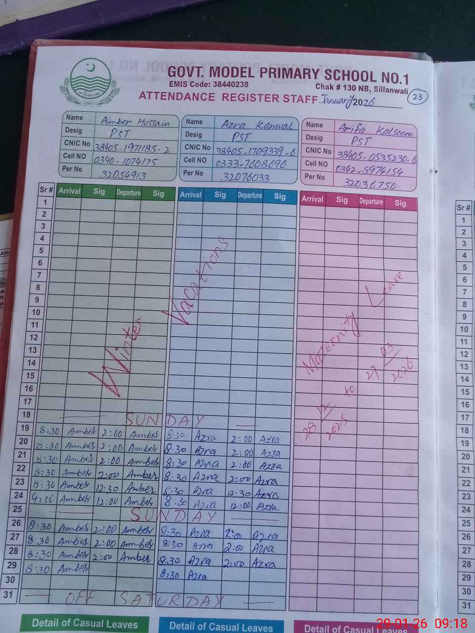 | 38**** | Ar**** Ka**** | PST Science/Maths | Regular | 6 | 0 | 0 | 4 | 0 | 0 | 0 | 0 | 2 | Maternity |