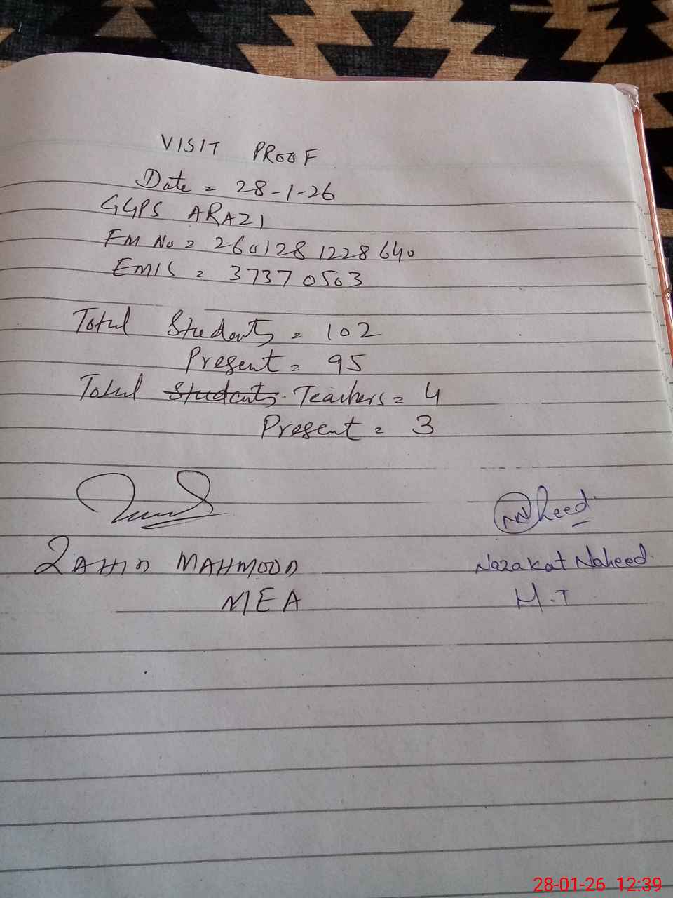 | Attendance Register | Head Teacher | MEA with School | Visit Proof |