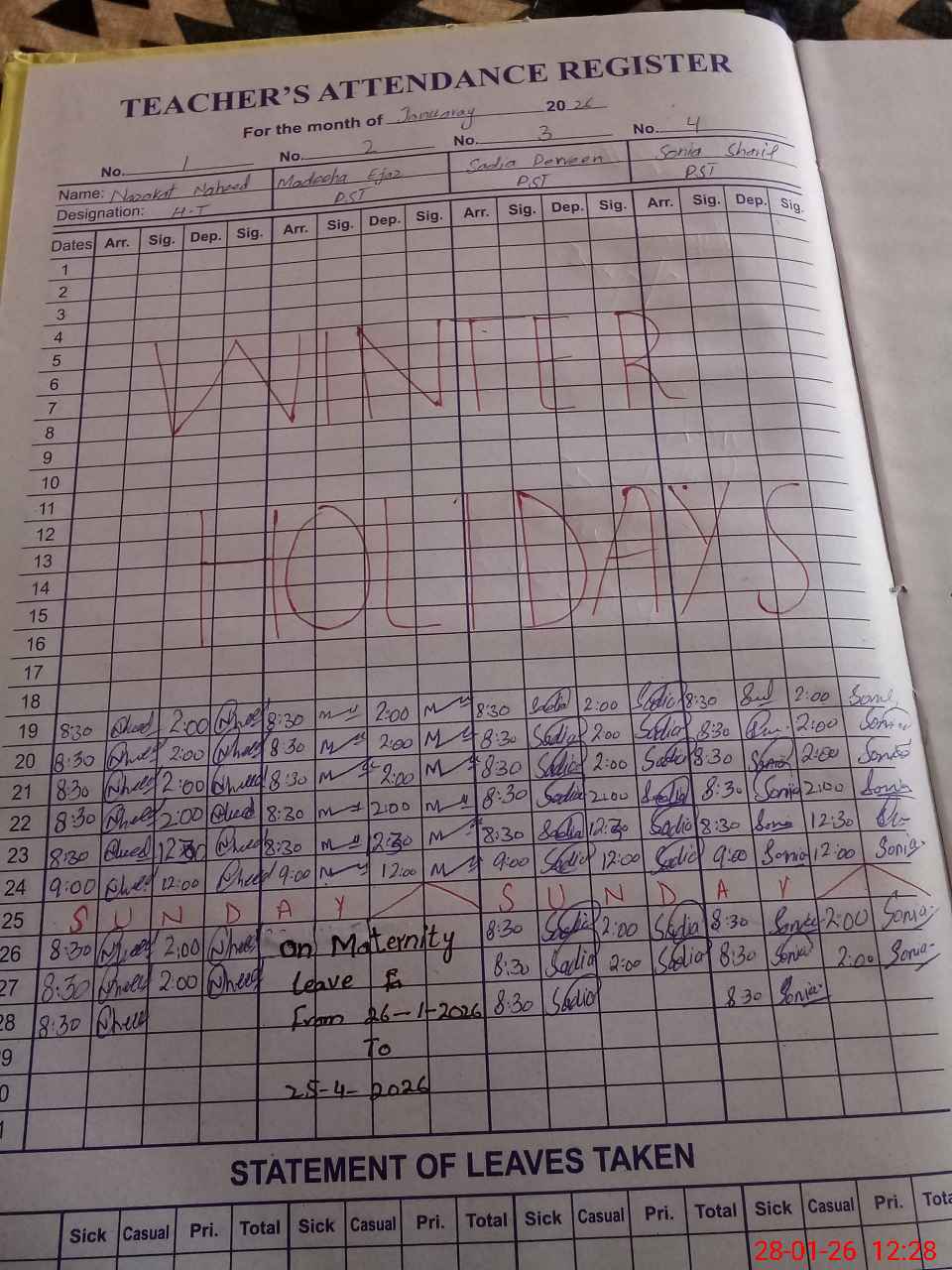 | Leave | Duty | Absent | Maternity | Medical | Ex- Pak |