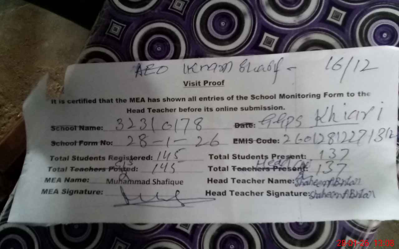 | Attendance Register | Head Teacher | MEA with School | Visit Proof |
