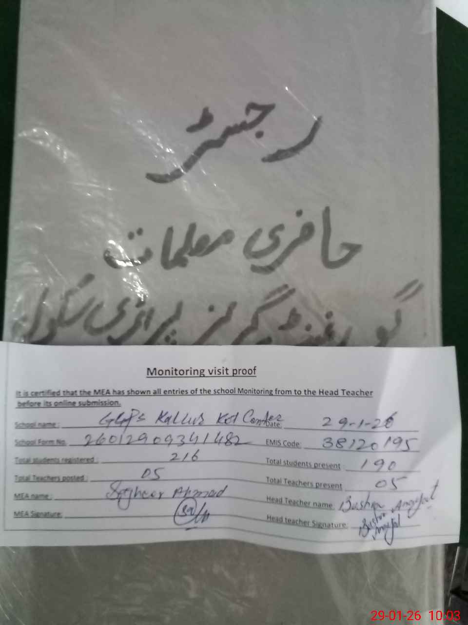 | Attendance Register | Head Teacher | MEA with School | Visit Proof |