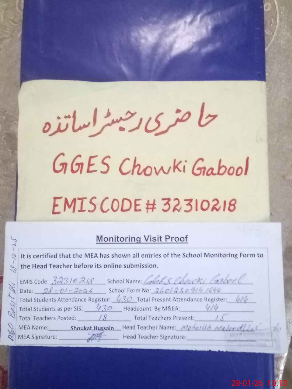 | Attendance Register | Head Teacher | MEA with School | Visit Proof |