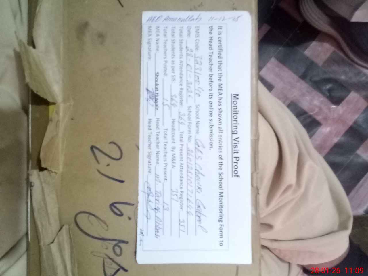 | Attendance Register | Head Teacher | MEA with School | Visit Proof |
