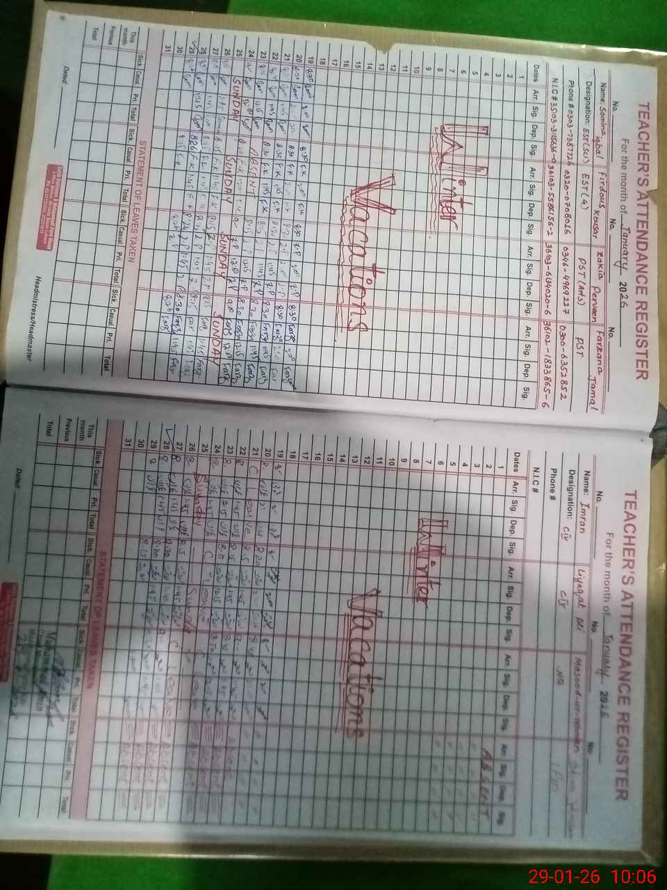 | Remarks (Use Separate Page if Required): PST Hina Hassan absent wef 01 September 2025 to till date today on 29 January 2026 | |||||