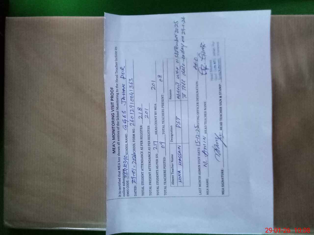 | Attendance Register | Head Teacher | MEA with School | Visit Proof |